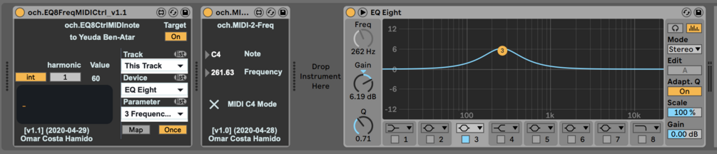 Control Ableton Live's EQ8 Frequency parameter with incoming MIDI notes.